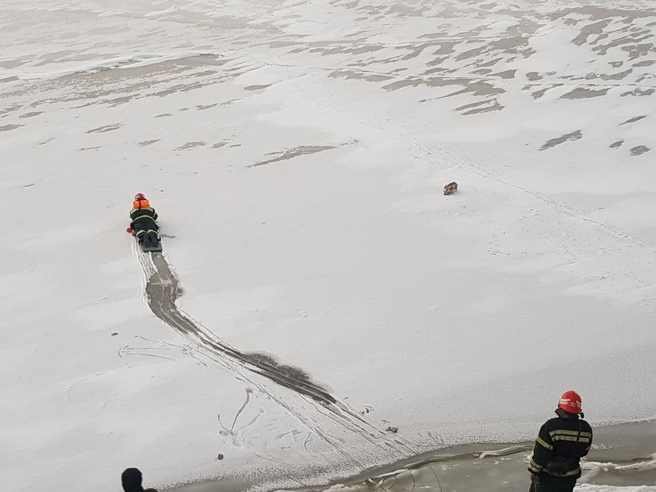 Работники ГСЧС с помощью спасательной веревки спасли птицу из ледяной лунки. Спасенного лебедя передали местным жителям.