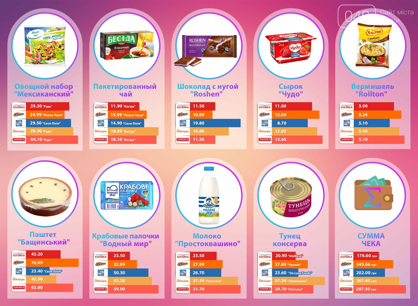 Суммировав все позиции, оказалось, что самая бюджетная потребительская корзина в «Копійка» — 178 гривен 60 копеек. В то время, как в «АТБ» придётся переплатить за тот же продуктовый набор 24 грн. Дороже всего набор этих продуктов стоит в «Таврия В» – 287 грн 50 копеек.