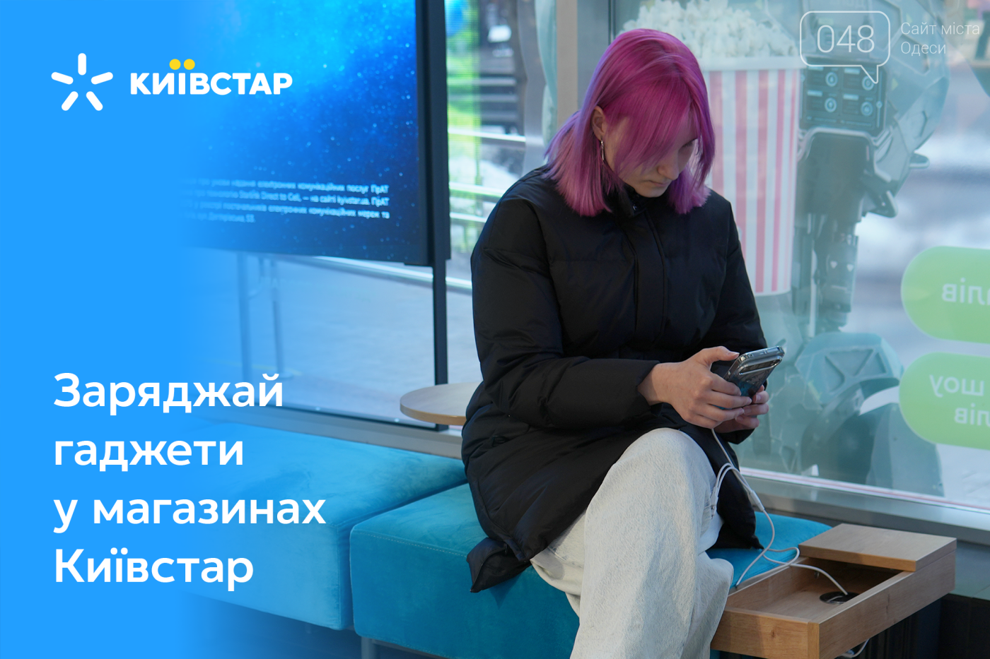 В умовах масштабних відключень електроенергії Київстар пропонує тим, хто проходить повз чи проживає поруч з магазином, підзарядити власні малоспоживаючі гаджети, а саме смартфони, годинники чи планшети, під час перебування у торгових точках. Також відвідувачі можуть скористатись безоплатним Wi-Fi.