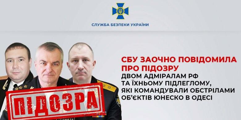 Служба безпеки України заочно повідомила про підозру двом російським адміралам та їхньому підлеглому, які командували обстрілами об’єктів ЮНЕСКО в Одесі. СБУ зібрала доказову базу та висновки експертиз на ворожих військових посадовців. У відомстві нагадали, що 5 листопада 2023 року окупанти вдарили протикорабельною ракетою середнього радіусу дії типу 3М55 "Онікс" по об’єктам Світової спадщини ЮНЕСКО, що розташовані в центральній частині Одеси. Внаслідок во...