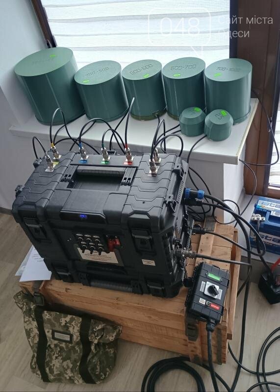 В комплекті блок акумуляторної батареї ємністю 32 ампер/годин, виконаний як окремий захищений кейс з 24 вольтовою LiFePo4 батареєю, з індикатором, блоками зарядки всередині від прикурювача та від 220 В та всіма необхідними кабелями, дозволяє працювати комплексу автономно в режимі "випромінювання" більше години.