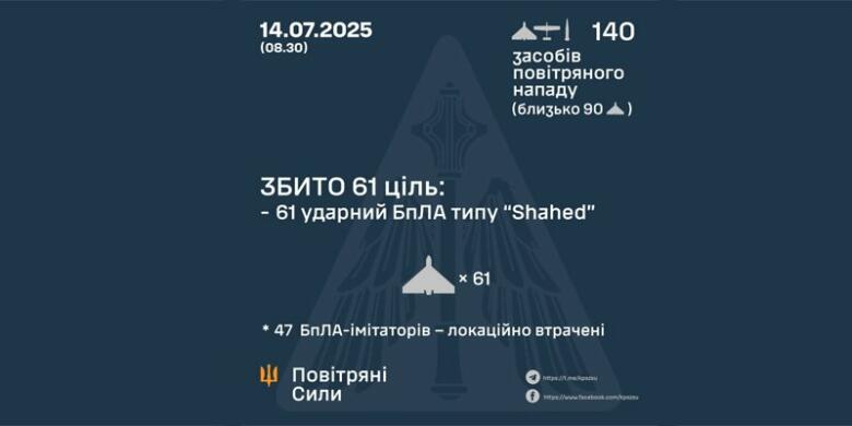 Силы противовоздушной обороны Украины сбили 61 из 136 российских беспилотников, которые атаковали страну с вечера воскресенья до утра понедельника. 47 дронов-имитаторов были локационно потеряны или подавлены системами радиоэлектронной борьбы, зафиксировано попадание 28 БПЛА в 10 локациях. Как сообщили Воздушные силы Вооруженных сил Украины в Телеграме, с 18:30 воскресенья, 13 июля, россияне атаковали Украину четырьмя зенитными управляемыми ракетами С-300/4...