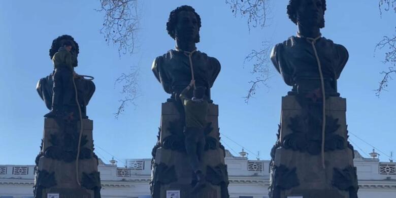 Как объяснила руководительница организации Екатерина Мусиенко, акция должна была символизировать намерение "отправить" постамент в музей. На Приморском бульваре в Одессе активисты общественной организации «Делаем Вам нервы» устроили перформанс, посвященный будущему памятника Александру Пушкину. Скульптуре набросили на шею трос в виде петли, а на постаменте появилось объявление с призывом помочь найти бульдозер — якобы для демонтажа. По мнению активистов, ф...